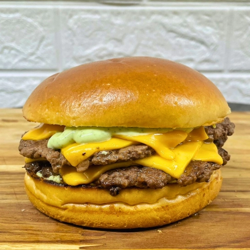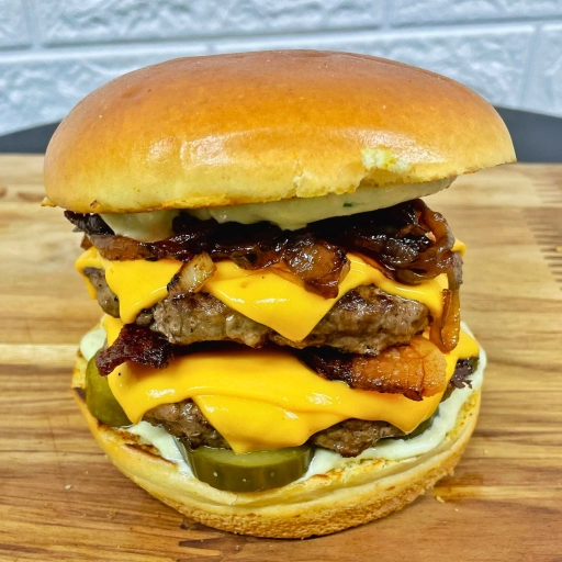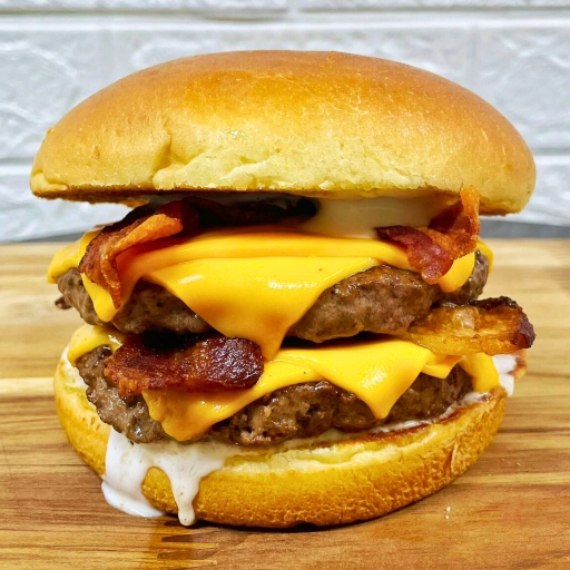 Pão de brioche, 2 blend bovino de 120gr cada, cheddar duplo, tiras de bacon duplo e maionese de alho.
