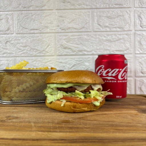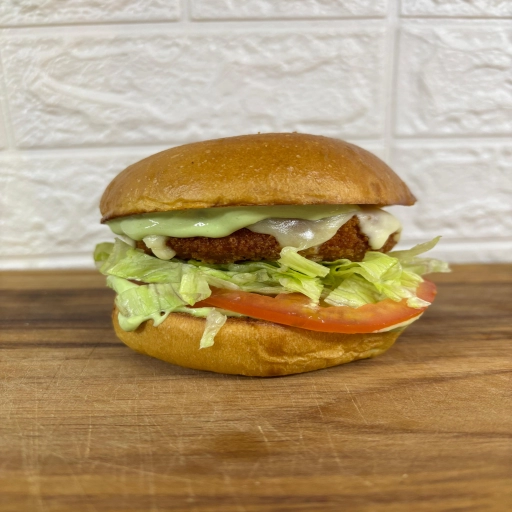 Pão de brioche, molho verde artesal, hambúrguer de frango empanado de 100g, mussarela, alface e tomate