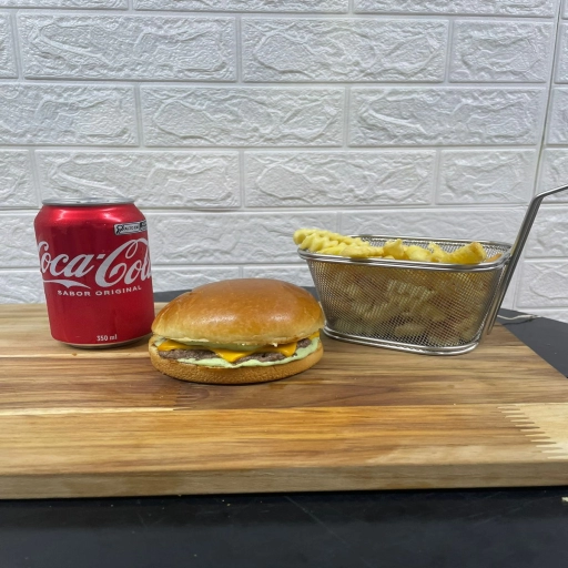 1 refrigerante ou suco lata + batata 200gr + 1 lanche: Pão de brioche, maionese, 2 Smash bovino de 90gr cada e cheddar.