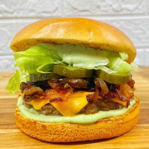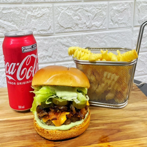 Pão de brioche, blend bovino de 120gr, mussarela, bacon, cebola caramelizada, picles de pepino, alface e maionese verde... Ver completo