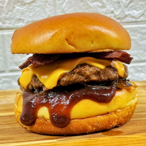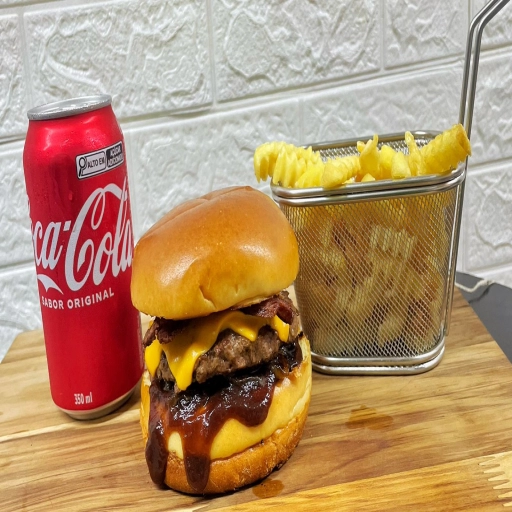 Pão de brioche, blend bovino de 120gr, mussarela, tiras de bacon, cebola caramelizada e molho barbecue.