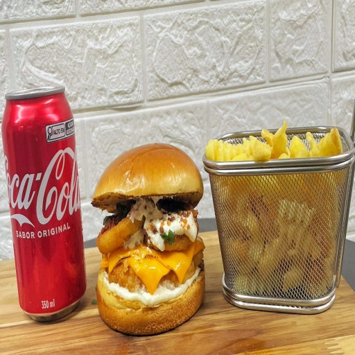 1 refrigerante ou suco lata + batata 200gr + 1 lanche: Pão de brioche, cream cheese, hambúrguer de frango empanado de ... Ver completo