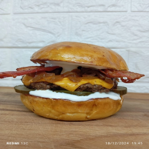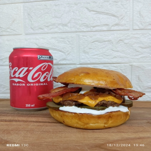 Pão de brioche, blend bovino de 120gr, cheddar, bacon, cebola caramelizada, picles de pepino e molho da casa.