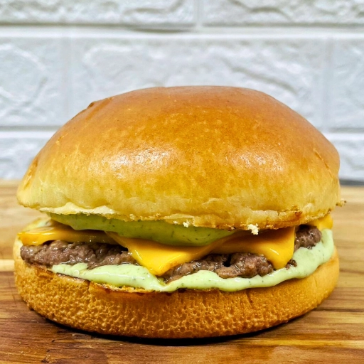 Pão brioche, blend bovino de 120gr, mussarela, tomate, cebola roxa, alface e maionese verde.